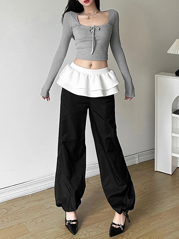 Loose Wrap Contrast Color Drawstring Falbala Casual Pants